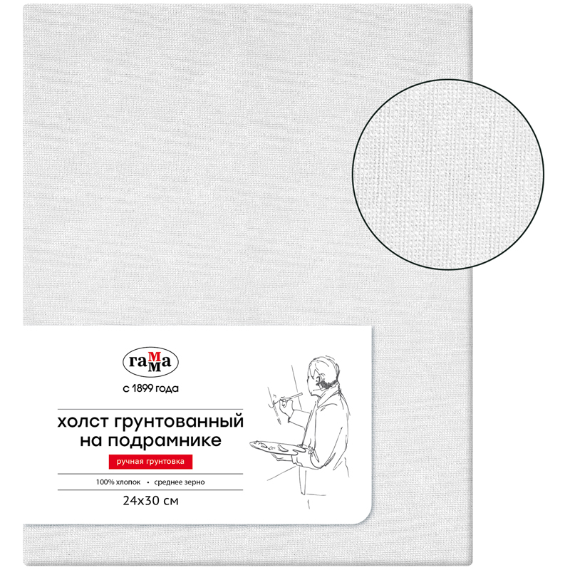 Холсты «ГАММА» с ручной грунтовкой натягиваются и грунтуются вручную. По традиционной технологии высококачественное 100% хлопковое полотно натягивают на сосновый подрамник с буртиком. Перед грунтовкой ткань проходит специальную обработку и проверку, для обеспечения ровной поверхности готового холста. Наши мастера сначала проклеивают каждый подрамник с натянутым полотном тремя слоями желатиновой проклейки и затем грунтуют тремя слоями масляно-эмульсионного грунта. Холсты прекрасно подходят для работ акриловыми и масляными красками. Массивный модульный подрамник, шириной 5 см, изготовлен из российской сосны, клинья для натяжки холста в комплекте. Холст упругий, не провисает после нанесения красок даже в несколько слоёв.