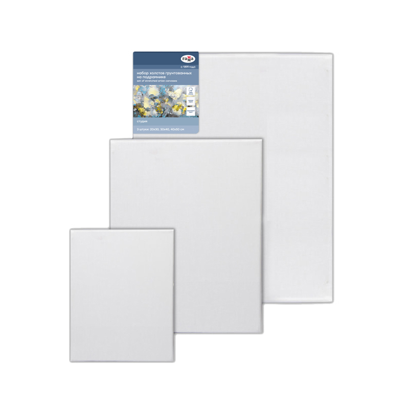 Набор хлопковых холстов на подрамнике ГАММА серии «Студия» грунтованных, подойдёт для живописи масляными, акриловыми, темперными и гуашевыми красками. Основа – натуральное полотно, 100% хлопок, мелкое зерно. Холсты прямоугольной формы плотностью 280 г/м2. В наборе 3 размера – 20*30, 30*40, 40*50 см. Холсты покрыты акриловым грунтом, а подрамники выполнены из сосны. Изготовлены без использования кислот. Подходят студентам художественных школ и училищ, начинающим и профессиональным художникам.