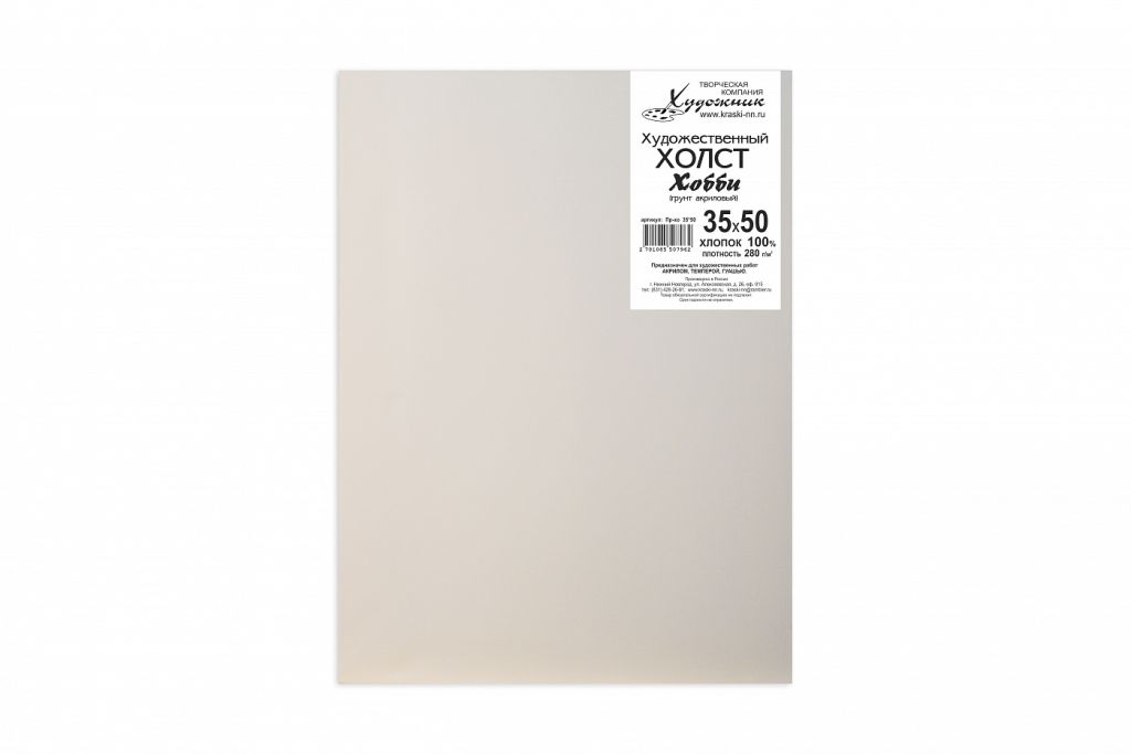 Данный холст относится к бюджетной линейке «Хобби», так как имеет облегченный подрамник шириной 30 мм. и среднюю степень натяжки холста. Используется для живописных работ акрилом темперой, гуашью. Относится к мелкозернистым. Имеет ровное плетение и гладкую фактуру, что позволяет прорабатывать мелкие детали. Торец холста -грунтованный. Натяжка холста музейная — скобы с задней стороны подрамника.