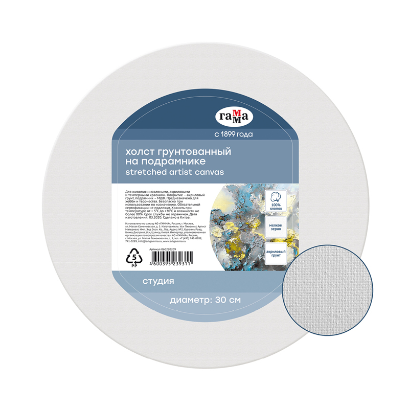 Хлопковый холст на подрамнике ГАММА серии «Студия», круглый и грунтованный, подойдёт для живописи масляными, акриловыми, темперными и гуашевыми красками. Основа – натуральное полотно, 100% хлопок, мелкое зерно. Холст круглой формы плотностью 280 г/м2. Холст покрыт акриловым грунтом, а подрамник выполнен из МДФ. Изготовлен без использования кислот. Подходит студентам художественных школ и училищ, начинающим и профессиональным художникам. • плотность 280 г/м?; • мелкое зерно; • 100% хлопок; • акриловый трёхслойный грунт; • подрамник из МДФ