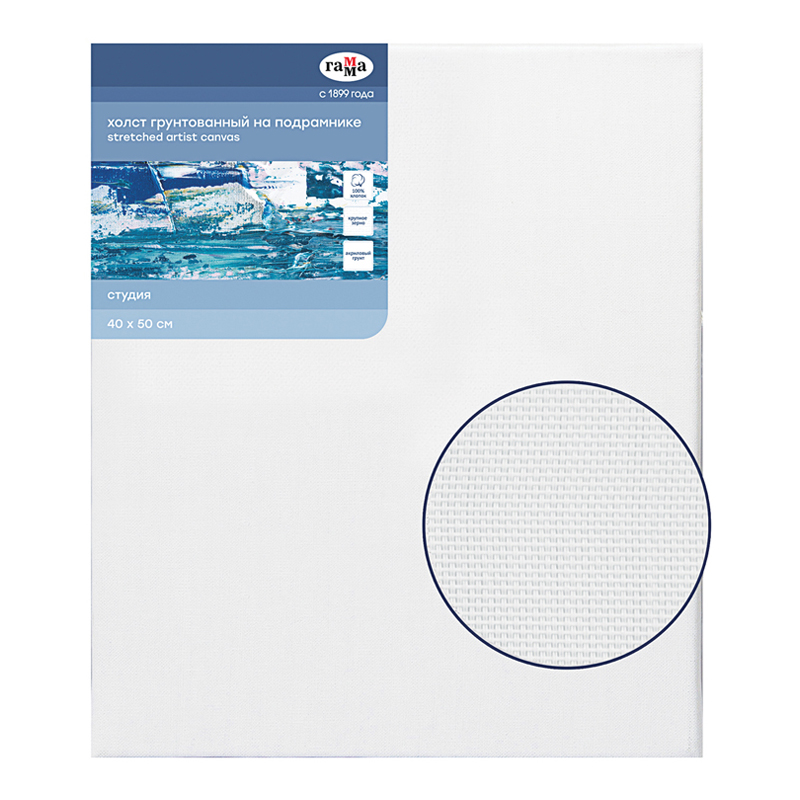 Холст изготовлен из хлопкового волокна и обладает крупнозернистой фактурой. Холст покрыт несколькими слоями акрила и натянут на подрамник, это полностью готовая основа для работ масляными, акриловыми и темперными красками. Высокий показатель плотности 400 гр/м2 обеспечивает возможность работы в пастозной и многослойной технике.