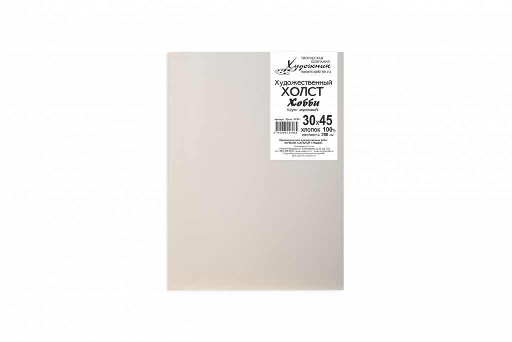Данный холст относится к бюджетной линейке «Хобби», так как имеет облегченный подрамник шириной 30 мм. и среднюю степень натяжки холста. Используется для живописных работ акрилом темперой, гуашью. Относится к мелкозернистым. Имеет ровное плетение и гладкую фактуру, что позволяет прорабатывать мелкие детали. Торец холста -грунтованный. Натяжка холста музейная — скобы с задней стороны подрамника.