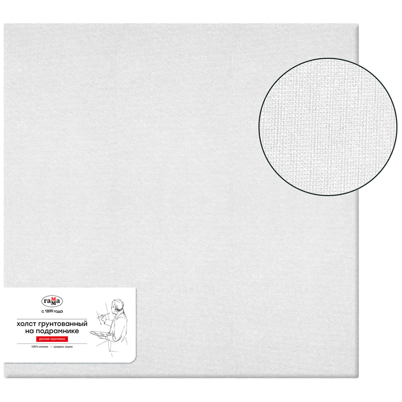 Холсты «ГАММА» с ручной грунтовкой натягиваются и грунтуются вручную. По традиционной технологии высококачественное 100% хлопковое полотно натягивают на сосновый подрамник с буртиком. Перед грунтовкой ткань проходит специальную обработку и проверку, для обеспечения ровной поверхности готового холста. Наши мастера сначала проклеивают каждый подрамник с натянутым полотном тремя слоями желатиновой проклейки и затем грунтуют тремя слоями масляно-эмульсионного грунта. Холсты прекрасно подходят для работ акриловыми и масляными красками. Массивный модульный подрамник, шириной 5 см, изготовлен из российской сосны, клинья для натяжки холста в комплекте. Холст упругий, не провисает после нанесения красок даже в несколько слоёв.