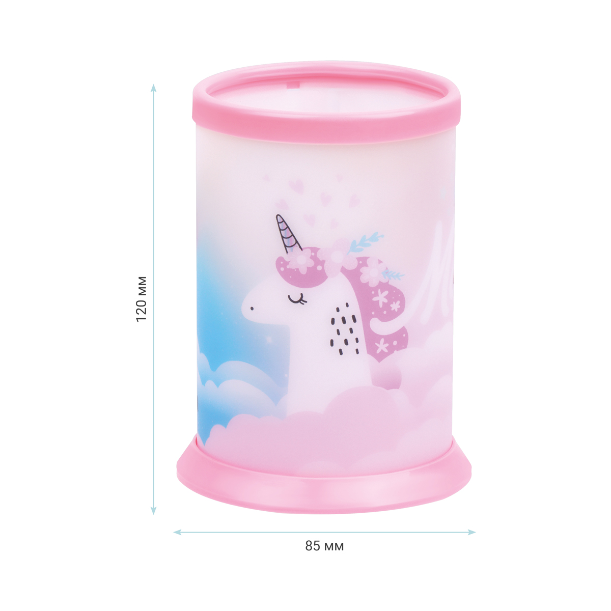 Подставка-стакан MESHU Unicorn в милом дизайне предназначена для хранения пишущих принадлежностей. Размер круглой подставки – 8,5*12 см. Подставка изготовлена из пластика. Упакована в ОПП пакет с европодвесом. Схема сборки подставки указана на упаковке.