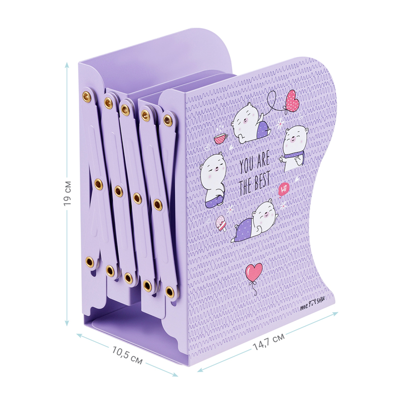 Раздвижная подставка для книг MESHU Beary Beary с 3 отделениями изготовлена из металла, благодаря чему ее конструкция надежная и крепкая. В сложенном виде корпус подставки имеет габариты 19*14,7*10,5 см. При необходимости подставка может раздвигаться до 50 см, что позволит организовать рабочее пространство и освободить место на рабочем столе. Яркий и современный дизайн подставки отлично впишется в интерьер. Подставка упакована в картонную коробку. • Материал корпуса: металл; • Размер: 19*14,7*10,5 см; • Количество отделений: 3.