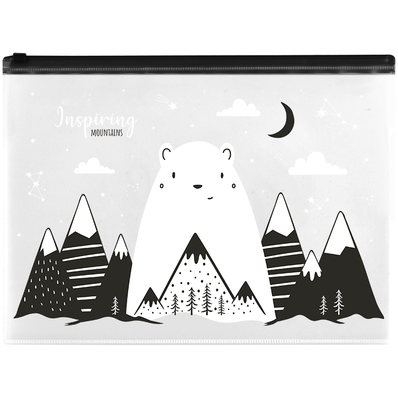 Папка-конверт на молнии MESHU Inspiring mountains – стильный помощник, который подойдет для хранения тетрадей, блокнотов, ежедневников форматов А4 и А5. Папка формата А4 вмещает до 60 листов стандартной офисной бумаги. Изготовлена из прочного полипропилена толщиной 150 мкм с гладкой фактурой. Размер горизонтальной папки – 330*230 мм. Папка имеет герметичную застежку-зиплок чёрного цвета, которая защищает документы от механических повреждений, пыли и влаги. Милый и стильный чёрно-белый рисунок с медведем в горах понравится всем любителям современных дизайнов.