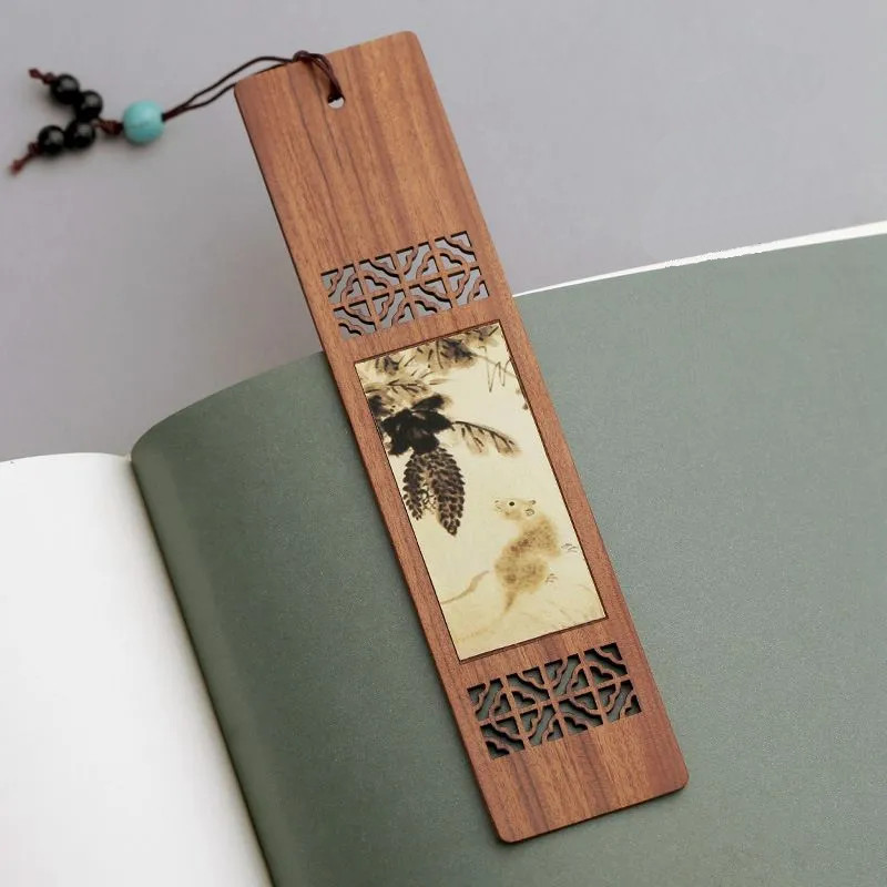 Император династии Мин Чжу Чжаньцзи не только успешно развивал политику Китая, но и серьезно увлекался живописью. Особенно хорошо у него получались изображения животных. На закладке для книг «Мышь и камень», выполненной из древесины африканского палисандра, изображен фрагмент одной из художественных работ этого незаурядного императора. В дополнении к этому, изделие украшено традиционным китайским орнаментом, выполненным по современной технологии лазерной резки по дереву, которая с удивительной точностью передает мельчайшие детали изображения.