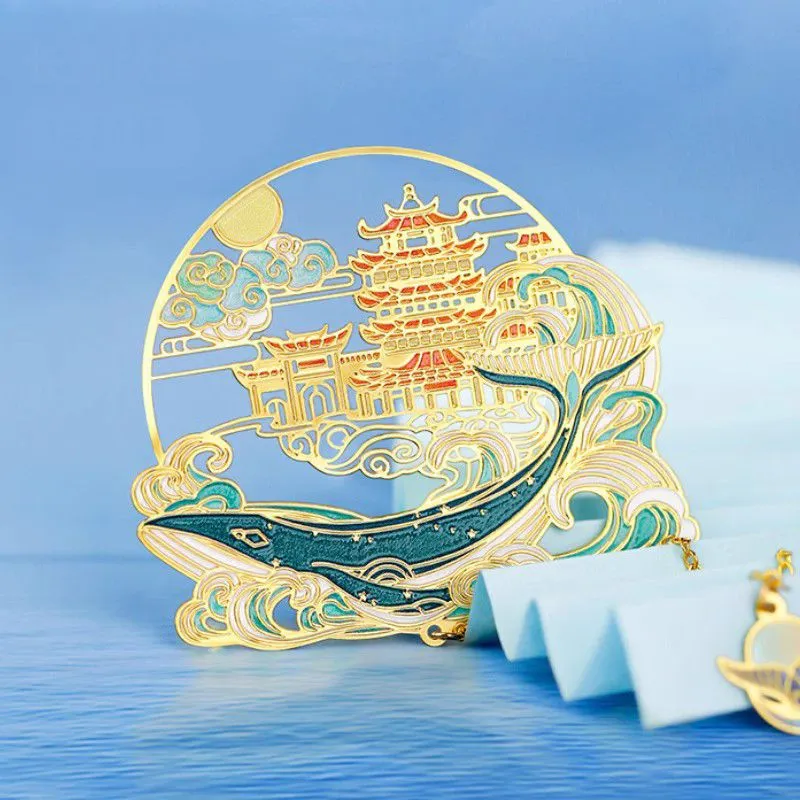 Символ кита один из самых важных образов в китайской культуре. В китайской культуре кит является символом имперской власти, долголетия, благополучия, счастья и богатства. На закладке для книг «Кит переплывает море» этот морской великан изображен на фоне традиционной китайской пагоды. Закладка изготовлена из высококачественной латуни по технологии ювелирной лазерной резки, покрыто красочной эмалью и декорировано изящной подвеской в форме китового хвоста.