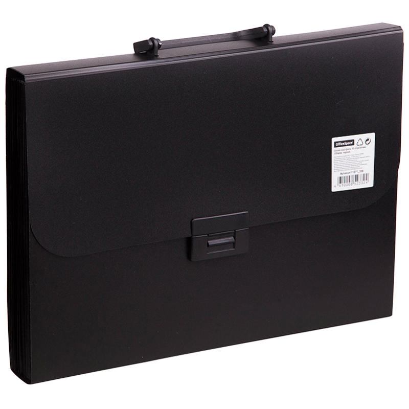 Папка-портфель 13 отделений OfficeSpace, формата A4, изготовлена из пластика толщиной 700мкм, черного цвета. Используется для хранения и перевозки большого количества документов. Портфель застегивается на клапан.