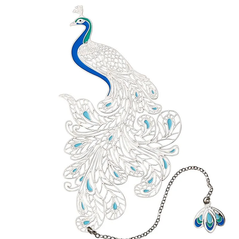 Закладка для книг «Павлин распускает перья» изготовлена из высококачественной серебристой меди по технологии ювелирной лазерной резки, покрыта красочной эмалью и декорирована оригинальной подвеской.