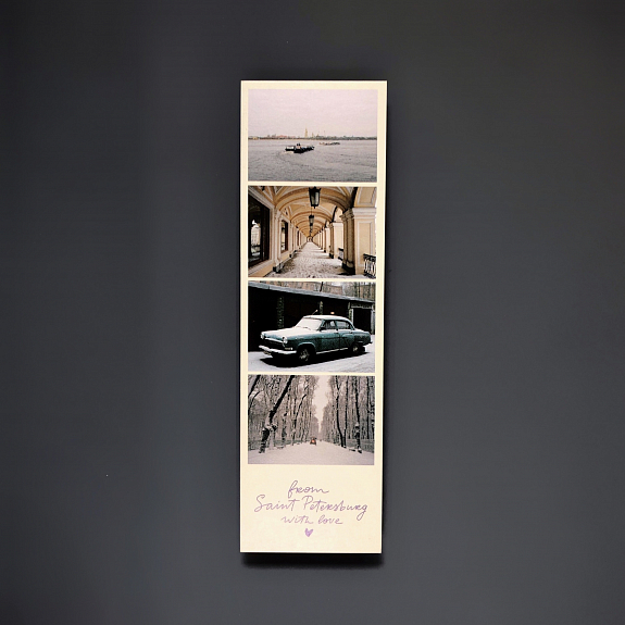Бумажная закладка — это лёгкий способ продолжить чтение на том же месте, где вы остановились. Закладка выполнена из плотного картона и украшена тематическим принтом в виде коллажа из фотографий самых ярких мест нашей культурной столицы.