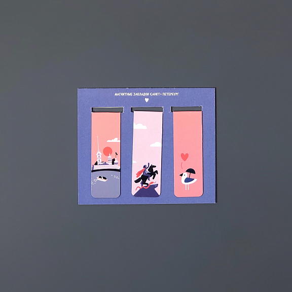 Магнитная закладка поможет запомнить и быстро найти нужную страницу книги. Полностью магнитное основание позволит крепко зафиксировать закладку в нужном месте. В наборе 3 закладки с иллюстрациями по мотивам достопримечательностей Санкт-Петербурга.