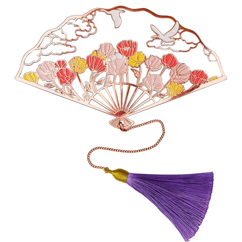 Журавль в китайской культуре символизирует вечную жизнь, счастье и благополучие, а цветущий мак символически ассоциируется с неувядаемой молодость и женским очарованием. Ажурная закладка для книг «Журавли над маковым полем» выполнена из нержавеющей стали по технологии ювелирной лазерной резки, покрыта красочной эмалью и декорирована изящной подвеской в виде кисти.