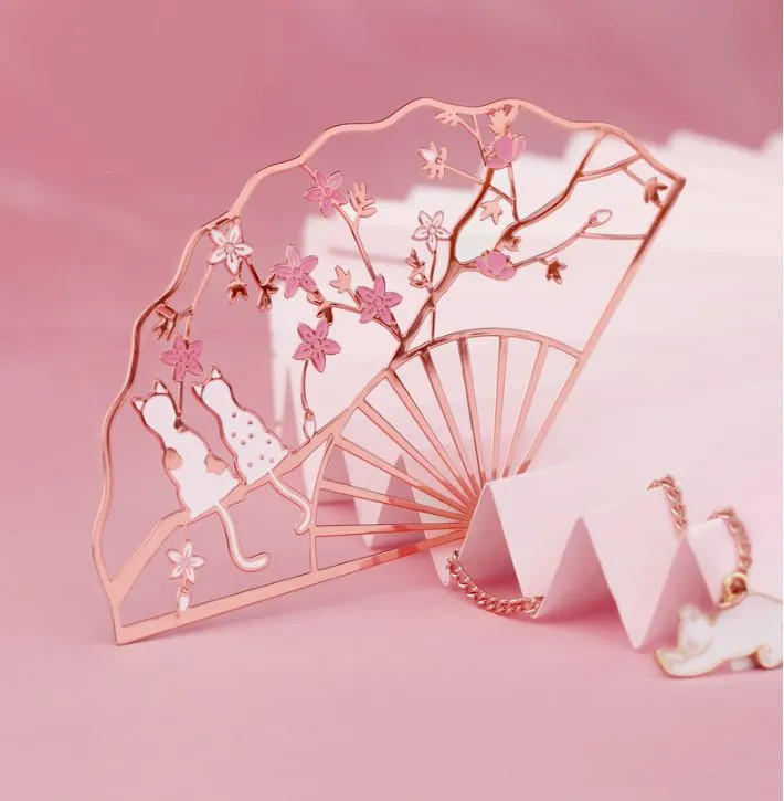 В восточной культуре и мифологии образ кошки является символом тепла, домашнего уюта, а также существом защищающим от злых духов. На закладке для книг «Цветы и кошки» изображена пара милых котиков сидящих на ветвях цветущей сакуры. Изделие выполнено из высококачественной нержавеющей стали в форме миниатюры традиционного китайского веера. Ажурная форма закладки достигается путем производства по технологии ювелирной лазерной резки, с цветовым дополнением высокостойких красок. Закладка декорирована миниатюрной подвеской с изображением котёнка.