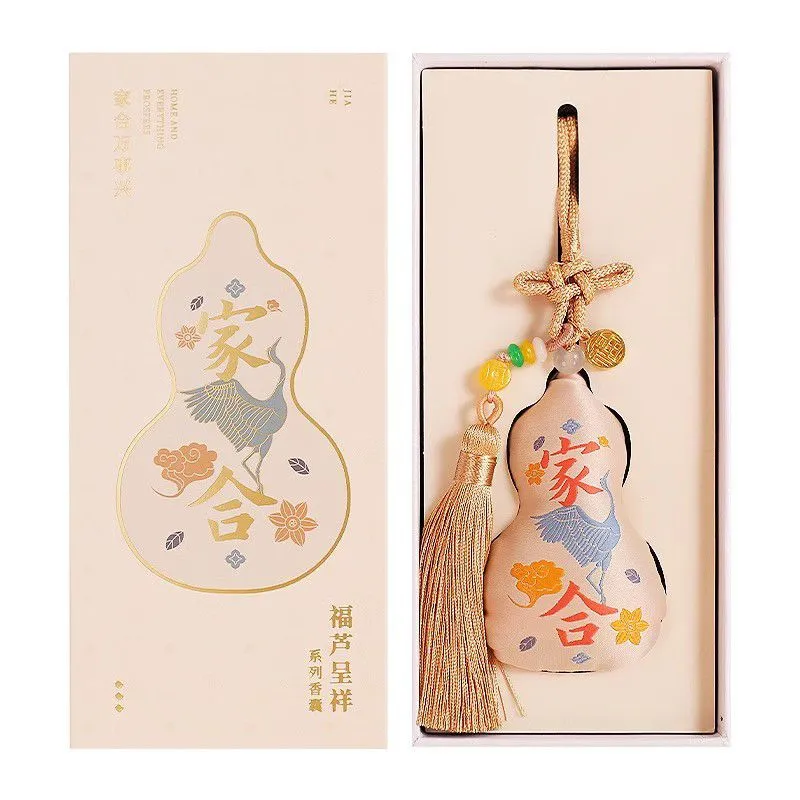 Брелок-закладка «Семья» выполнен в форме китайского символа здоровья — тыквы-горлянки. Он сшит из яркой набивной ткани и украшен миниатюрной кисточкой. На изделии изображен журавль, символизирующий счастье и процветание.