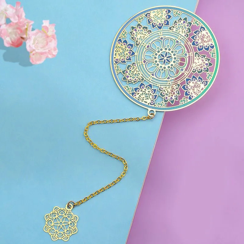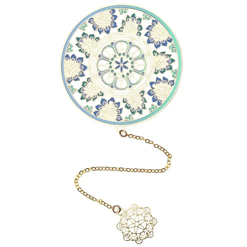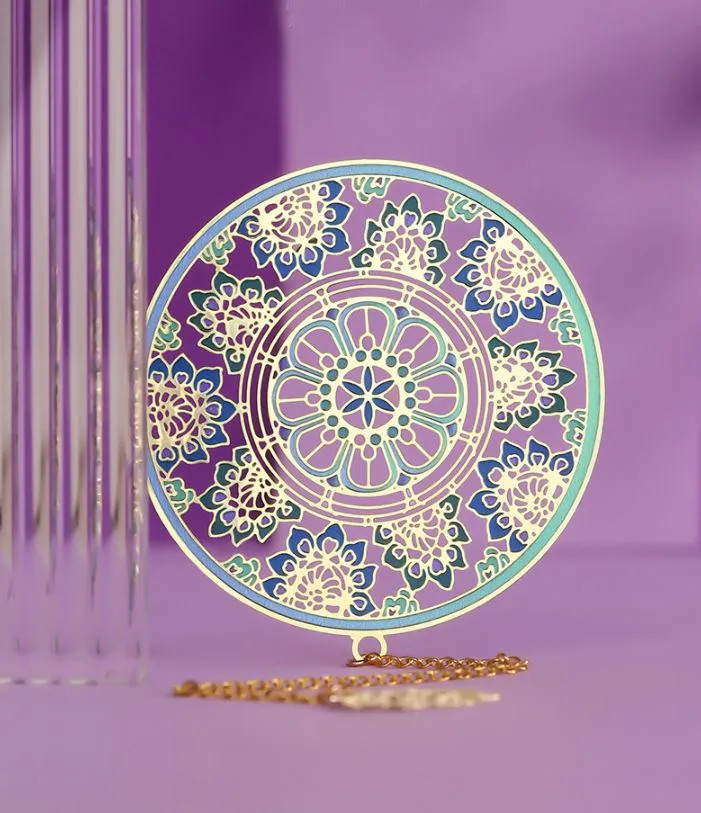 Дуньхуан — город-озазис, в древности служивший воротами в Китай на Великом шёлковом пути. Именно там находятся пещеры Магао, своды которых украшены множеством уникальных фресок. Закладка для книг «Сокровище Дуньхуана» несет в себе фрагмент одного из этих изображений — ажурный орнамент лазурных водорослей. Закладка выполнена из высококачественной латуни по технологии ювелирной лазерной резки, покрыта красочной эмалью и декорирована изящной подвеской.