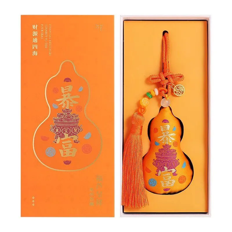 Брелок-закладка «Внезапное богатство» выполнен в форме китайского символа здоровья — тыквы-горлянки. Он сшит из яркой набивной ткани и украшен миниатюрной кисточкой. На изделии изображена традиционная курильница для благовоний, символизирующая благость.