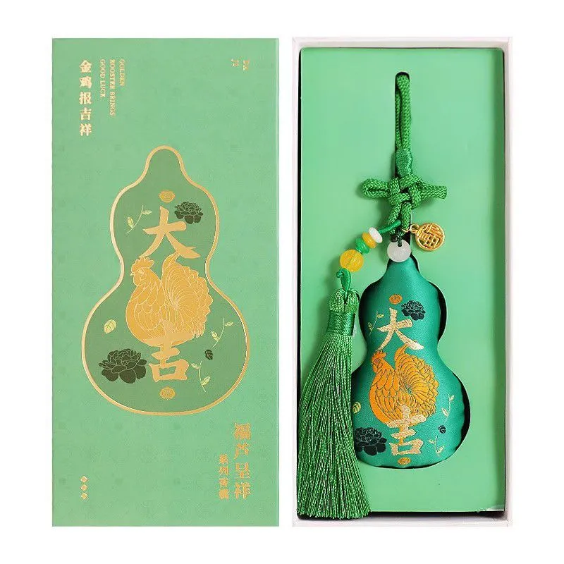 Брелок-закладка «Много счастья» выполнен в форме китайского символа здоровья — тыквы-горлянки. Он сшит из яркой набивной ткани и украшен миниатюрной кисточкой. На изделии изображен петух, являющийся талисманом защищающим человека от невзгод и нечистой силы.