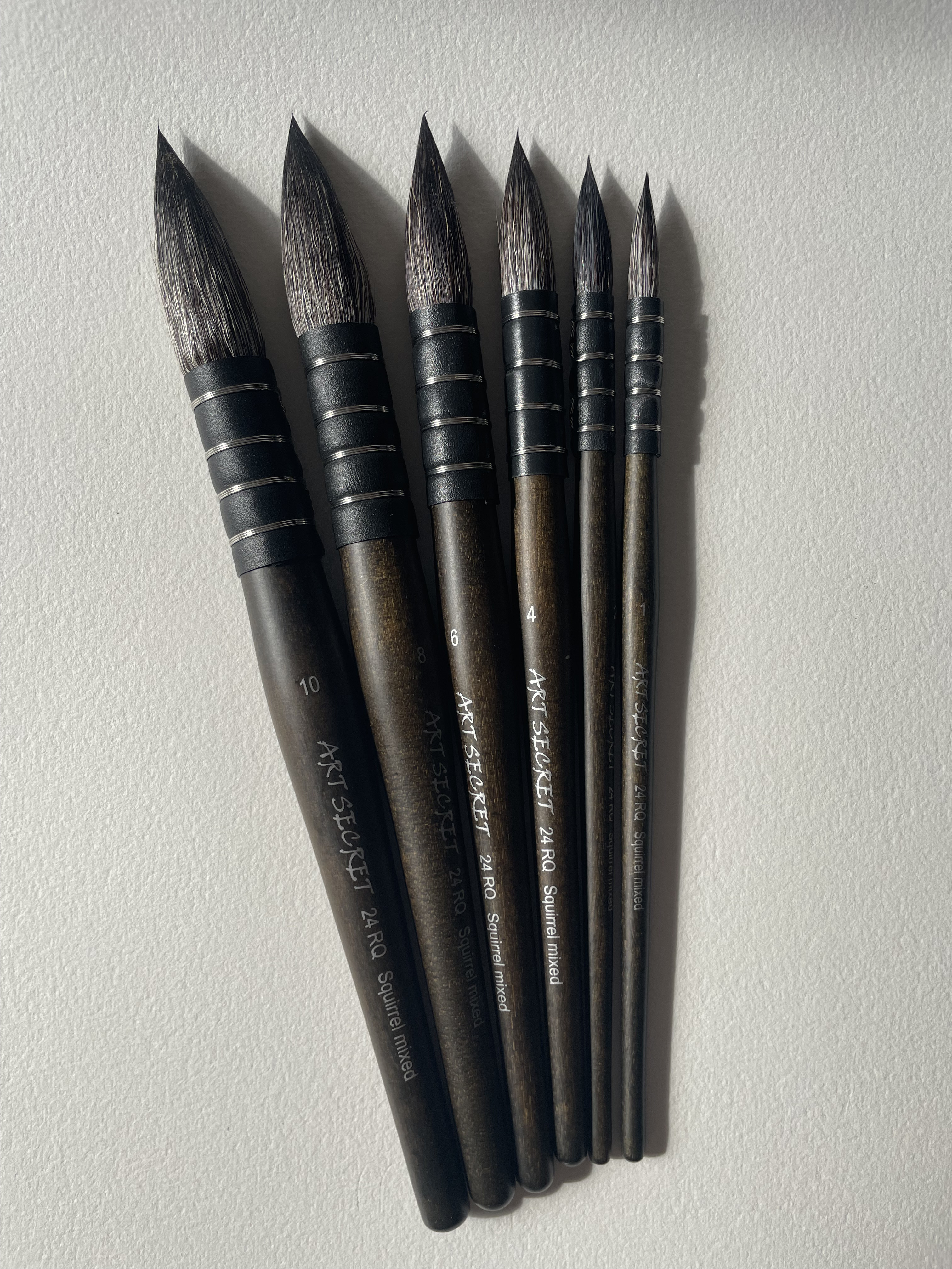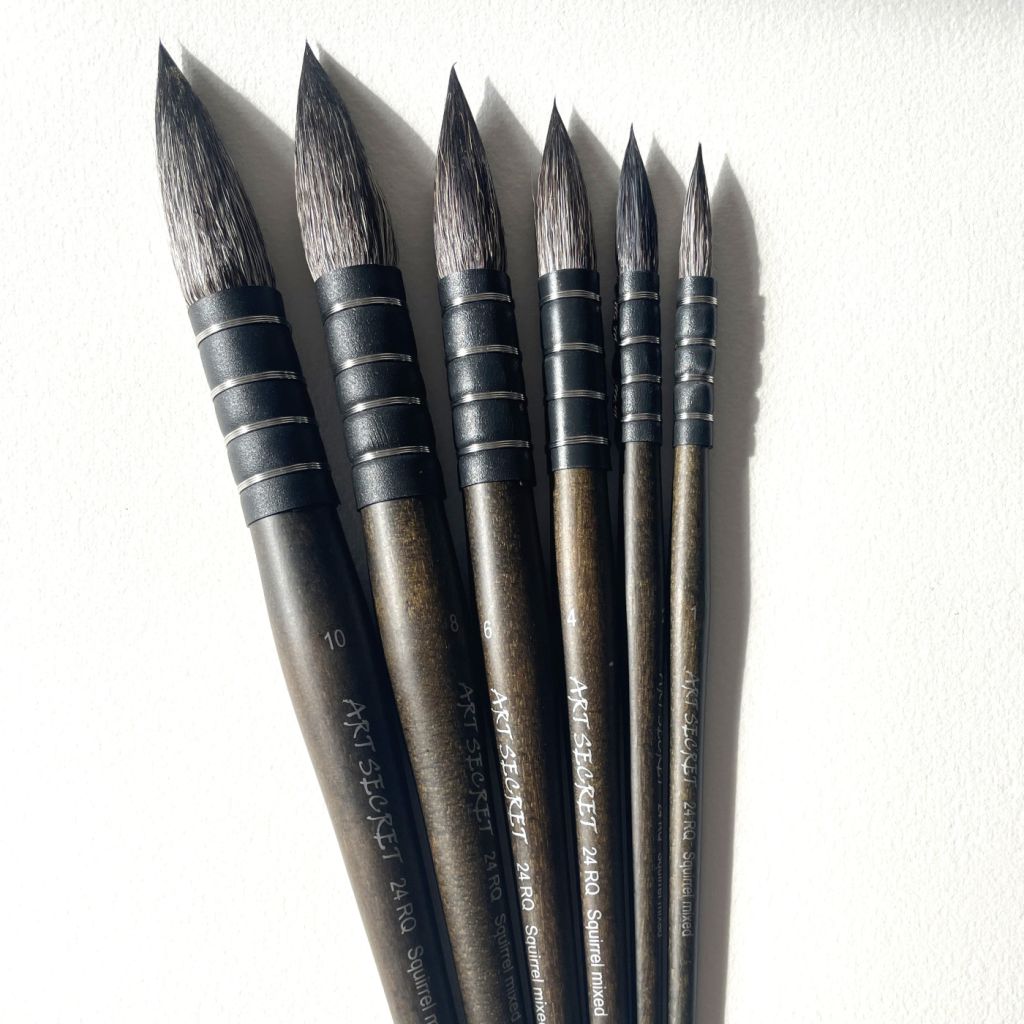 Кисти серии 24RQ от бренда Art Secret созданы вручную специально для работы акварелью. Объёмный пучок кисти из смеси беличьего ворса и синтетики сочетает мягкость, упругость и повышенную износоустойчивость, обладает отличными впитывающими свойствами, необходимыми для акварельной живописи. Французский тип крепления также позволяет набирать краску по всей длине ворса. Кисти отлично держат форму, а благодаря заострённому кончику и широкому размерному ряду позволяют не только создавать большие заливки и цветовые пятна, но и работать с деталями.