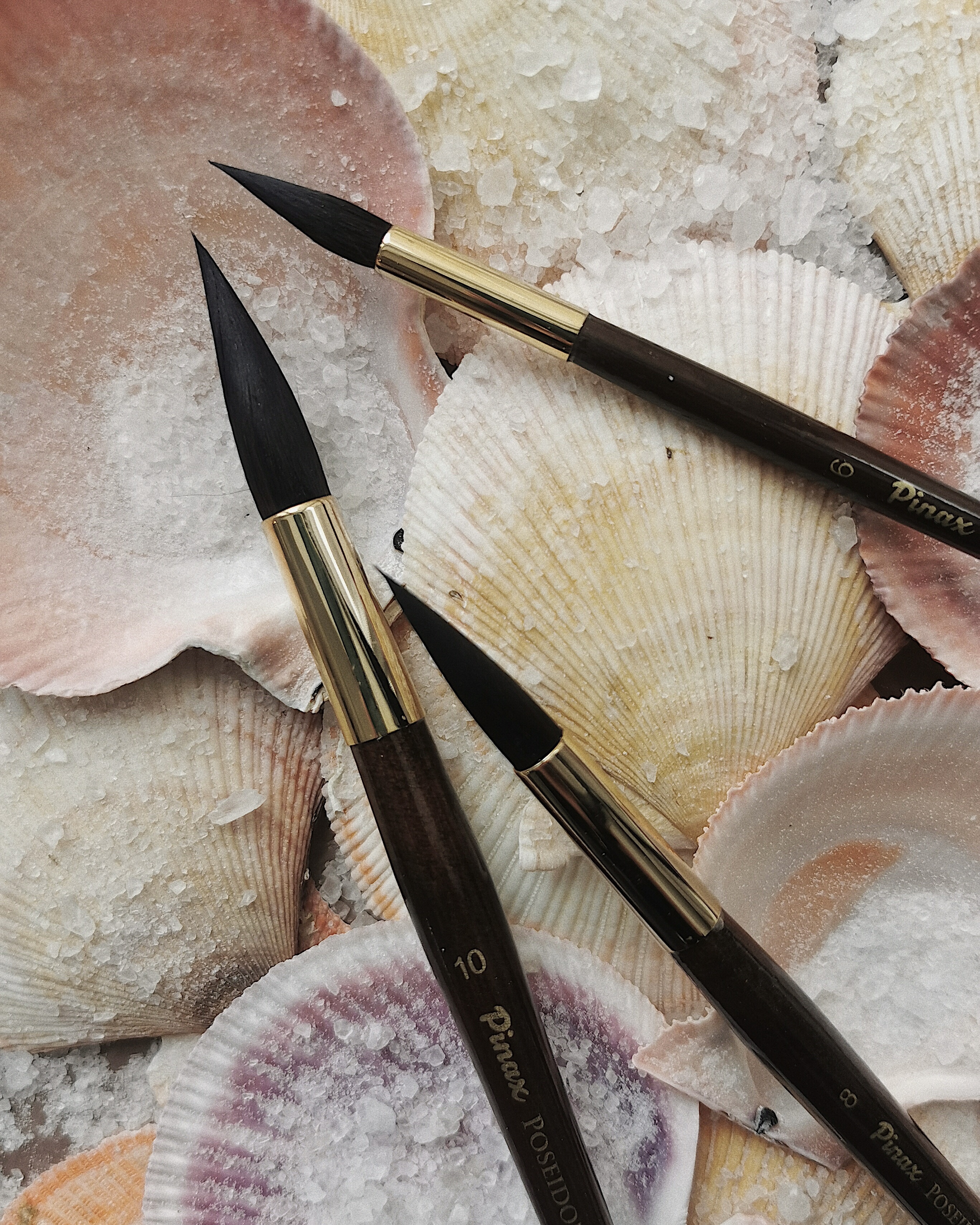 Кисти серии "Poseidon 814" — это последняя разработка от производителя Pinax. Особенностью этой серии является обойма — укороченная латунная золотистая втулка, которая является заменой французского крепления. Инновационная технология крепления втулки к короткой ручке кисти без обжима, которая не мешает хвату кисти в области ближе к ворсу и создает баланс для комфортной работы художника. В линии кистей "Poseidon 814" была сохранена уникальная остроконечная форма пучка кисти Poseidon 801 c французским креплением, которая позволяет выполнить всю работу одним номером - переходя от заливок к деталям. Состав волоса также остался на прежнем высоком уровне — это смесь натурального беличьего волоса и высокотехнологичной синтетической имитации белки японского производства. Уникальность заключается в тщательно подобранной пропорции, в которой смешиваются синтетика и волос белки. Синтетика в составе кисти играет очень важную роль - именно благодаря ей кисть приобретает дополнительную упругость и управляемость, так недостающую кистям сделанным только из белки, при этом, сохраняет способность удерживать достаточное количество краски, равномерно отдает краску на основу, не ставит кляксу.