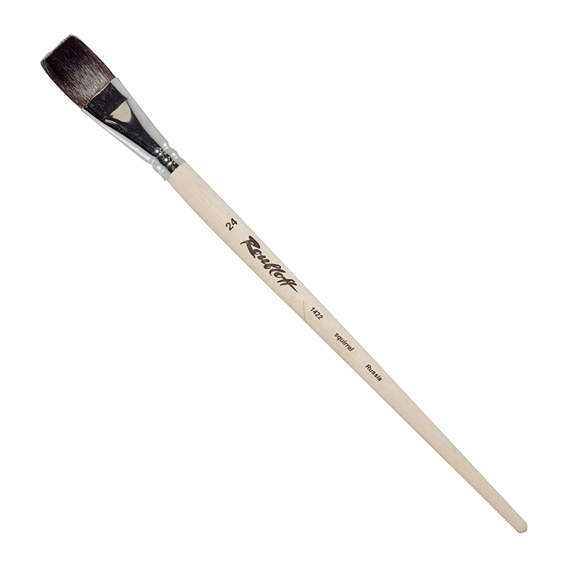 О серии: кисти серии «1422» изготавливаются из волоса белки. Серия представлена кистями плоской формы. Серия представлена кистями с различной толщиной пучка. Характеристика: для производства используется волос, собранный с хвостов белок. Пучок кистей удлинён и имеет плоскою форму. Кисти выполнены на длинной матовой ручке пропитанной лаком. Крепление пучка к древку выполнено хромированной медной обоймой с двойным обжимом. Применение: кисти этой серии в основном используются для работ акварелью и гуашью. Кистями такой формы удобно прорисовывать прямые линии. На усмотрение художника возможно использование кистей в других техниках живописи. Производство: изготавливаются под брендом Roubloff, который был основан в 1988 году в Кировской области (Россия). Кировская область – один из центров народных промыслов в России. Здесь же занимаются разведением пушных зверей, чей мех является идеальным материалом для кистей. Продукция бренда Roubloff – кисти самого разного назначения, размера и формы. Весь материл, используемый при производстве продукции, проходит отбор, чтобы каждый клиент получил лучшие кисти для своих работ. Кисти марки Roubloff являются одними из лучших в России.