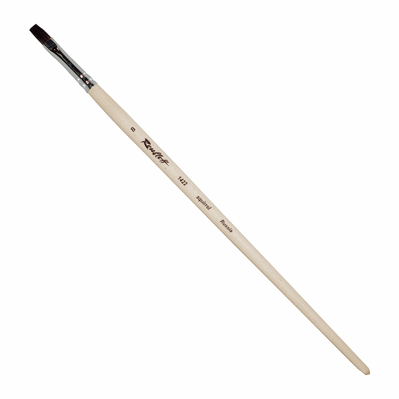 О серии: кисти серии «1422» изготавливаются из волоса белки. Серия представлена кистями плоской формы. Серия представлена кистями с различной толщиной пучка. Характеристика: для производства используется волос, собранный с хвостов белок. Пучок кистей удлинён и имеет плоскою форму. Кисти выполнены на длинной матовой ручке пропитанной лаком. Крепление пучка к древку выполнено хромированной медной обоймой с двойным обжимом. Применение: кисти этой серии в основном используются для работ акварелью и гуашью. Кистями такой формы удобно прорисовывать прямые линии. На усмотрение художника возможно использование кистей в других техниках живописи. Производство: изготавливаются под брендом Roubloff, который был основан в 1988 году в Кировской области (Россия). Кировская область – один из центров народных промыслов в России. Здесь же занимаются разведением пушных зверей, чей мех является идеальным материалом для кистей. Продукция бренда Roubloff – кисти самого разного назначения, размера и формы. Весь материл, используемый при производстве продукции, проходит отбор, чтобы каждый клиент получил лучшие кисти для своих работ. Кисти марки Roubloff являются одними из лучших в России.