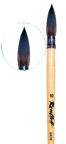 О серии: кисти серии «QA10» изготовлены из ворса белки с добавление ворса других видов. Серия представлена кистями круглой формы. Серийно выпускаются кисти следующих размеров: 8, 10, 12, 14. Характеристика: для изготовления кистей используется специально подобранный ворс. Пучок кисти удлинён и имеет заострённую форму. Кисти, выполненные из такого материала, служат дольше чем кисти, изготовленные только из ворса белки. Кисти выполнены на короткой пропитанной лаком ручке. Отличительной особенностью серии является крепление пучка кисти к древку при помощи специальной пластиковой прозрачной обоймы. Применение: кисти этой серии в основном используются для работ водорастворимыми красками (гуашь, акварель). На усмотрение художника возможно использование кистей в других техниках живописи. Производство: изготавливаются под брендом Roubloff, который был основан в 1988 году в Кировской области (Россия). Кировская область – один из центров народных промыслов в России. Здесь же занимаются разведением пушных зверей, чей мех является идеальным материалом для кистей. Продукция бренда Roubloff – кисти самого разного назначения, размера и формы. Весь материл, используемый при производстве продукции, проходит отбор, чтобы каждый клиент получил лучшие кисти для своих работ. Кисти марки Roubloff являются одними из лучших в России.