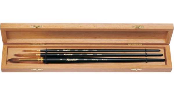 Комплектация: в набор входит 3 кисти круглой формы из волоса белки (№2, 5, 9). Набор упакован в подарочную коробку из бука. Характеристика: кисти, входящие в этот набор изготовлены из натурального волоса белки. Толщина таких волосинок достигает 0,07 миллиметров, а кончик волоска сильно заострен. Кисти из такого материала отличаются своей мягкостью и способностью хорошо впитывать жидкие краски и переносить из на поверхность работы. Набор укомплектован кистями круглой формы с заостренным кончиком. Все кисти изготовлены на длинной черной матовой ручке с обоймой из хромированной меди. Применение: кисти из такого материала используются в основном для выполнения работ акварельными или гуашевыми красками. На усмотрение художника кисти могут быть использованы для работы с другими материалами. Производство: изготавливаются под брендом Roubloff, который был основан в 1988 году в Кировской области (Россия). Кировская область – один из центров народных промыслов в России. Здесь же занимаются разведением пушных зверей, чей мех является идеальным материалом для кистей. Продукция бренда Roubloff – кисти самого разного назначения, размера и формы. Весь материл, используемый при производстве продукции, проходит отбор, чтобы каждый клиент получил лучшие кисти для своих работ. Кисти марки Roubloff являются одними из лучших в России.