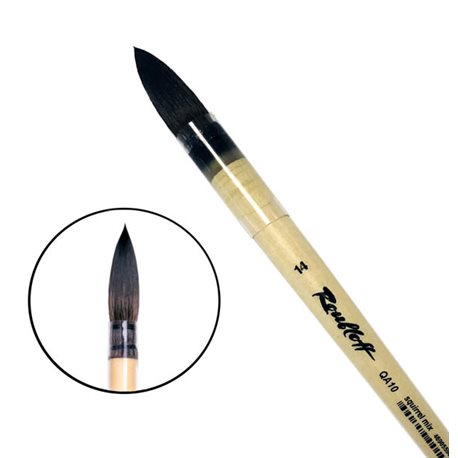О серии: кисти серии «QA10» изготовлены из ворса белки с добавление ворса других видов. Серия представлена кистями круглой формы. Серийно выпускаются кисти следующих размеров: 8, 10, 12, 14. Характеристика: для изготовления кистей используется специально подобранный ворс. Пучок кисти удлинён и имеет заострённую форму. Кисти, выполненные из такого материала, служат дольше чем кисти, изготовленные только из ворса белки. Кисти выполнены на короткой пропитанной лаком ручке. Отличительной особенностью серии является крепление пучка кисти к древку при помощи специальной пластиковой прозрачной обоймы. Применение: кисти этой серии в основном используются для работ водорастворимыми красками (гуашь, акварель). На усмотрение художника возможно использование кистей в других техниках живописи. Производство: изготавливаются под брендом Roubloff, который был основан в 1988 году в Кировской области (Россия). Кировская область – один из центров народных промыслов в России. Здесь же занимаются разведением пушных зверей, чей мех является идеальным материалом для кистей. Продукция бренда Roubloff – кисти самого разного назначения, размера и формы. Весь материл, используемый при производстве продукции, проходит отбор, чтобы каждый клиент получил лучшие кисти для своих работ. Кисти марки Roubloff являются одними из лучших в России.