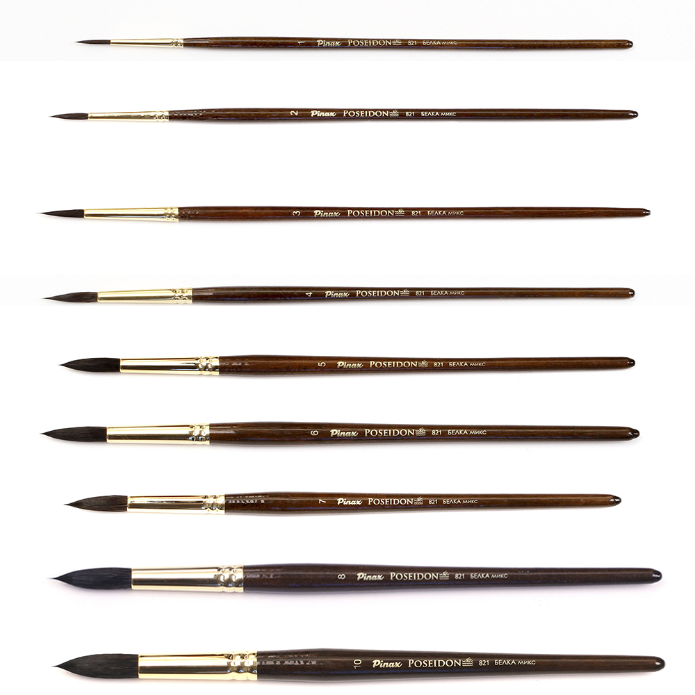О серии: Poseidon 821 - это круглые кисти производства Pinax, которые состоят из волоса белки и японской синтетики, имитирующей волос белки. Волос кисти подобран специально для работы жидкими красками и тушью. Эти кисти идеально подойдут для различных акварельных техник живописи, за счет своей формы и способности удержать много краски. Номер кисти равен диаметру кисти в миллиметрах, в месте где ворс выходит из обоймы. Кисть оснащена медной втулкой золотого цвета, короткая ручка (европейский стандарт 165 мм) выполнена из березы, покрашена под орех и покрыта глянцевым лаком. Применение: кисти серии подходят для декоративно-оформительского творчества и хобби. Производство: данный товар представлен брендом Pinax. Pinax — мировой бренд товаров, который представлен на российском рынке с начала XXI века. Изначально компания производила только кисти для художественных работ, но затем расширила свое производство и не потеряв качество своей продукции начала производить холсты, мольберты и аксессуары для художников. Сейчас ассортимент включает в себя большое количество наименований.