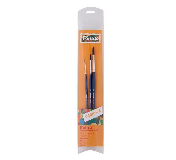Комплектация: данный набор укомплектован синтетическими кистями «под белку». В набор входит 3 круглые кисти: №1, 3, 5. Упаковка выполнена из прозрачного пластика. Характеристика: кисти этой серии изготавливаются из высококачественной японской синтетики, которая по своим свойствам напоминает натуральный беличий ворс. Волос мягкий с умеренной упругостью, заострен к кончику. Кисти из такого материала хорошо удерживают и отдают воду. Синтетический волос делает кисть более износостойкой и долговечной. Пучок кисти имеет круглую форму и заострен к кончику. Кисти выполнены на короткой ручке синего цвета и покрыты глянцевым лаком. Применение: кисти серии подходят для широкого круга потребителей, они одинаково удобны для учащихся и для профессиональных художников. Кисти разработаны для выполнения работ в техниках акварельной живописи. Производство: данный товар представлен брендом Pinax. Pinax — бренд товаров, который представлен на российском рынке с начала XXI века. Изначально компания производила только кисти для художественных работ, но затем расширила свое производство и не потеряв качество своей продукции начала производить холсты, мольберты и аксессуары для художников. Сейчас ассортимент включает в себя большое количество наименований.