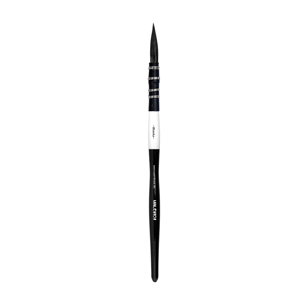 Кисти Blanka изготовлены из мягкой синтетики черного цвета, имитирующей белку. Такой ворс отлично подходит для акварели. Благодаря удлиненному ворсу кисть впитывает больше влаги и дольше удерживает ее. Практичные кисти данной серии сочетают в себе преимущества натурального ворса и износостойкости синтетики, а значит меньше изнашиваются. Лаконичный дизайн и черно-белая цветовая гамма выглядят благородно и делают эти кисти не только надежным художественным инструментом, но и красивым аксессуаром. В серии представлены кисти с французским типом крепления, который обеспечивает более длинную выставку ворса и максимально продолжительную линию. Благодаря нескользящему покрытию кисти удобно держать в руках.