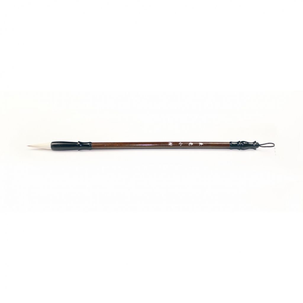 Классическая кисть для каллиграфии используется для работы с тушью. Рабочая часть кисти изготовлена из натурального ворса волка и козы. Ворс характеризуется сочетанием мягкости и упругости. Кисть хорошо собрана, в смоченном состоянии держит тонкий кончик. Характеристики: Материалы: ворс козы и шерсть волка, мореное дерево. Общая длина кисти – 28.5 см. Длина ворса - 3.5 см. Диаметр у основания ворса 0.9 см.