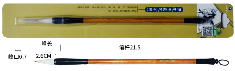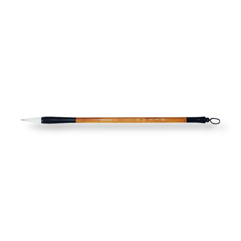 Классическая кисть для каллиграфии используется для работы с тушью. Рабочая часть кисти изготовлена из натурального ворса волка и козы. Ворс характеризуется сочетанием мягкости и упругости. Кисть хорошо собрана, в смоченном состоянии держит тонкий кончик. Характеристики: Материалы: ворс волка и козы, мореное дерево. Общая длина кисти – 21.5 см. Длина ворса - 2.6 см. Диаметр у основания ворса 0.7 см.