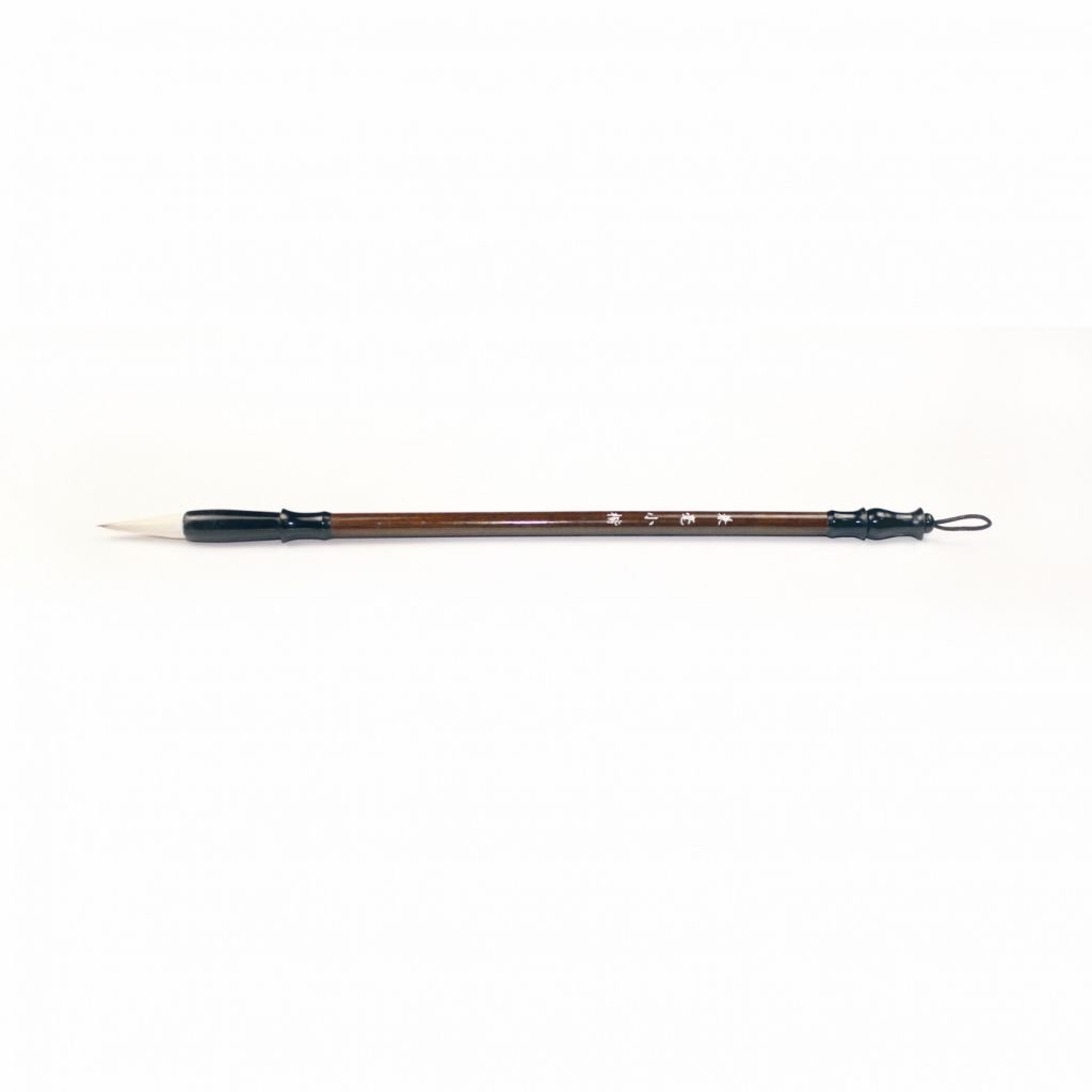 Классическая кисть для каллиграфии используется для работы с тушью. Рабочая часть кисти изготовлена из натурального ворса волка и козы. Ворс характеризуется сочетанием мягкости и упругости. Кисть хорошо собрана, в смоченном состоянии держит тонкий кончик. Характеристики: Материалы: ворс козы и шерсть волка, бамбук. Общая длина кисти - 27,5 см. Длина ворса - 3 см. Диаметр у основания ворса 0,8 см.