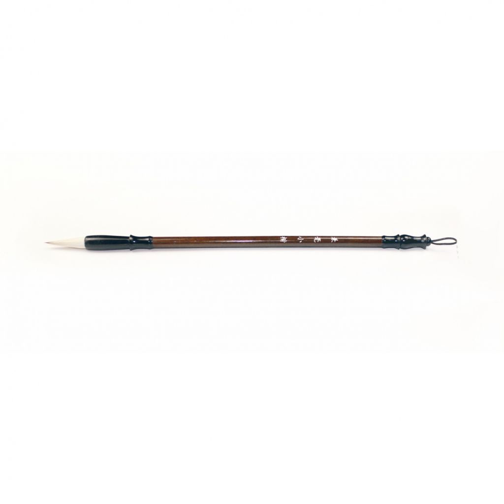 Классическая кисть для каллиграфии используется для работы с тушью. Рабочая часть кисти изготовлена из натурального ворса волка и козы. Ворс характеризуется сочетанием мягкости и упругости. Кисть хорошо собрана, в смоченном состоянии держит тонкий кончик. Характеристики: Материалы: ворс козы и шерсть волка, мореное дерево. Общая длина кисти – 28.5 см. Длина ворса - 3.5 см. Диаметр у основания ворса 0.9 см.