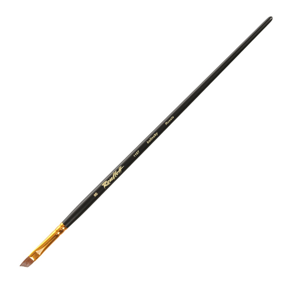 Кисть из волоса колонка с укороченной скошенной выставкой применима как в живописной технике, так и в декоративной росписи. Длинная черная ручка с матовым покрытием надежно скреплена с ворсом анодированной алюминиевой обоймой. Наклонная форма кисти дает возможность наносить точные мазки и выписывать изящные ленты и лепестки цветов одним круговым движением руки. В работе используется как край ворса для нанесения контуров, так и плоская часть поверхности пучка, что позволяет добиваться градиента от тени к светлым участкам. Идеальна для прорисовки мелких и средних краеугольных объектов, отлично подойдет для работы с маслом, акварелью и гуашью.