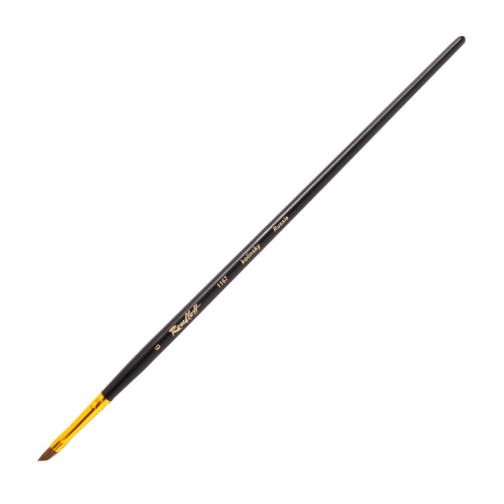 Кисть из волоса колонка с укороченной скошенной выставкой применима как в живописной технике, так и в декоративной росписи. Длинная черная ручка с матовым покрытием надежно скреплена с ворсом анодированной алюминиевой обоймой. Наклонная форма кисти дает возможность наносить точные мазки и выписывать изящные ленты и лепестки цветов одним круговым движением руки. В работе используется как край ворса для нанесения контуров, так и плоская часть поверхности пучка, что позволяет добиваться градиента от тени к светлым участкам. Идеальна для прорисовки мелких и средних краеугольных объектов, отлично подойдет для работы с маслом, акварелью и гуашью.