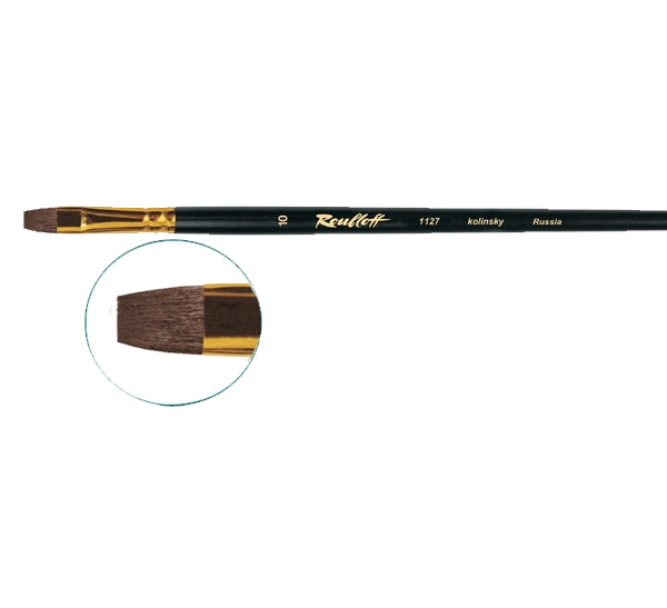 О серии: кисти серии «1127» изготавливаются из волоса колонка. В серии поштучно представлены кисти от №2 до №20. Характеристика: кисти «1127» изготавливаются из высококачественного колонкового ворса. Ворс кисти мягкий и одновременно упругий. Пучок кисти плоский с укороченной вставкой (ворс короткий). Крепление ворса к черенку обеспечивается алюминиевой анодированной обоймой с двойным обжимом. Кисти выполнены на длиной матовой ручке черного цвета. Применение: используются для выполнения работ водорастворимыми красками и маслом. Удобна для прорисовки прямых линий и прямоугольных форм. На усмотрение художника возможно использование с другими художественными материалами. Производство: изготавливаются под брендом Roubloff, который был основан в 1988 году в Кировской области (Россия). Кировская область – один из центров народных промыслов в России. Здесь же занимаются разведением пушных зверей, чей мех является идеальным материалом для кистей. Продукция бренда Roubloff – кисти самого разного назначения, размера и формы. Весь материл, используемый при производстве продукции, проходит отбор, чтобы каждый клиент получил лучшие кисти для своих работ. Кисти марки Roubloff являются одними из лучших в России.