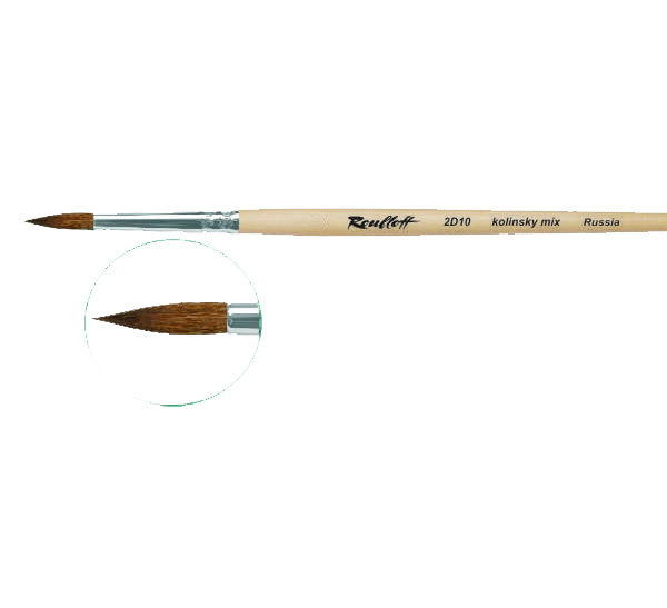 О серии: кисти серии «2D10» изготавливаются из смеси колонкового ворса и синтетики. Кисти выпускаются поштучно следующих размеров: №0, 1, 2, 3, 4, 5. Характеристика: для изготовления кистей серии «2D10» используется колонковый ворс и синтетические нити, которые по своим свойствам максимально похожи на волос колонка. Синтетические нити, использованные при производстве кистей этой серии, в разрезе напоминает форму звёздочки. Ранее такая синтетика не применялась для производства кистей. Кисти характеризуются мягкостью и упругостью. Износостойкие. Пучок кисти имеет круглую форму с заострённым кончиком. Вставка укороченная (ворс короткий). Крепление ворса к черенку обеспечивается алюминиевой обоймой с двойным обжимом. Кисти выполнены на короткой пропитанной лаком ручке. Применение: используются для выполнения работ водорастворимыми красками и маслом. На усмотрение художника возможно использование с другими художественными материалами. Производство: изготавливаются под брендом Roubloff, который был основан в 1988 году в Кировской области (Россия). Кировская область – один из центров народных промыслов в России. Здесь же занимаются разведением пушных зверей, чей мех является идеальным материалом для кистей. Продукция бренда Roubloff – кисти самого разного назначения, размера и формы. Весь материл, используемый при производстве продукции, проходит отбор, чтобы каждый клиент получил лучшие кисти для своих работ. Кисти марки Roubloff являются одними из лучших в России.
