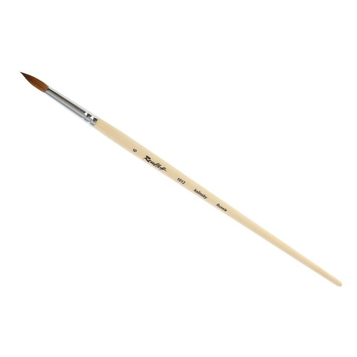 О серии: кисти серии «1012» изготавливаются из волоса колонка. Серия кистей представлена достаточно широким размерным рядом. Характеристика: кисти изготавливаются из тщательно подобранного колонкового ворса. Толщина волоса колонка достигает 0,15 миллиметров. Такой ворс отличается высоким качеством и сочетает в себе лучшие свойства. Ворс хорошо впитывает влагу (краску), Ворс достаточно мягкий и в меру упругий. Пучок кистей серии «1012» имеет круглую форму. Кончик кисти заострен. Кисти выполнены на длинной пропитанной лаком ручке. Крепление пучка к древку кисти выполнено медной хромированной обоймой с двойным обжимом. Применение: используется для выполнения работ водорастворимыми красками и маслом. На усмотрение художника возможно использование с другими художественными материалами. Производство: изготавливаются под брендом Roubloff, который был основан в 1988 году в Кировской области (Россия). Кировская область – один из центров народных промыслов в России. Здесь же занимаются разведением пушных зверей, чей мех является идеальным материалом для кистей. Продукция бренда Roubloff – кисти самого разного назначения, размера и формы. Весь материл, используемый при производстве продукции, проходит отбор, чтобы каждый клиент получил лучшие кисти для своих работ. Кисти марки Roubloff являются одними из лучших в России.