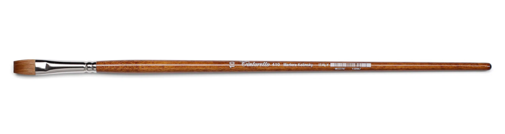 Кисти Tintoretto Martora Kolinsky произведены из ворса колнковой куницы, который обеспечивает высокую плавность и точность мазка. Кисть хорошо набирает и отдаёт краску особенно при большом количестве воды, отлично держит форму и острый кончик, подходит для детализации и точной работы. Пучок кисти закреплён на длинной деревянной ручке никелированной латунной обоймой.