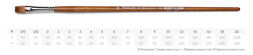 Кисти Tintoretto Martora Kolinsky произведены из ворса колнковой куницы, который обеспечивает высокую плавность и точность мазка. Кисть хорошо набирает и отдаёт краску особенно при большом количестве воды, отлично держит форму и острый кончик, подходит для детализации и точной работы. Пучок кисти закреплён на длинной деревянной ручке никелированной латунной обоймой.