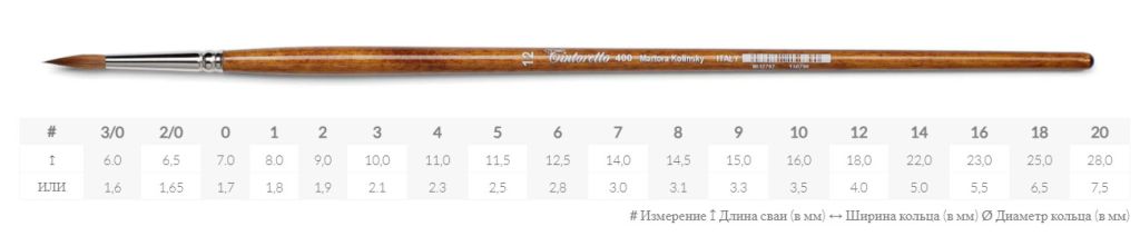 Кисти Tintoretto Martora Kolinsky произведены из ворса колнковой куницы, который обеспечивает высокую плавность и точность мазка. Кисть хорошо набирает и отдаёт краску особенно при большом количестве воды, отлично держит форму и острый кончик, подходит для детализации и точной работы. Пучок кисти закреплён на длинной деревянной ручке никелированной латунной обоймой.