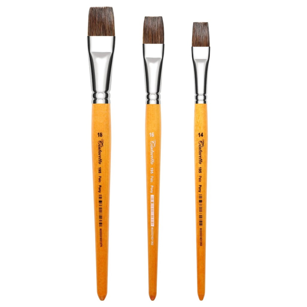 Кисти из ворса пони это бюджетная альтернатива кистям из бычьего ворса, главным свойством таких кистей является мягкость. Такие кисти популярны у новичков и студентов художественных школ, часто используются детьми, они не подходят для написания точных тонких линий, но иlеально подходят для лессировок и фоновых заливок. Кисть закреплена никелированной латунной обоймой на короткой деревянной ручке.