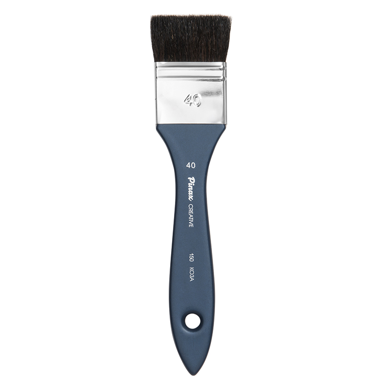 О серии: серия кистей «Creative 150» представлена флейцами из черного волоса козы. В серию входят кисти следующих номеров: № 25, 30, 40, 50 и 75. Номер кисти соответствует ее ширине (в миллиметрах). Все кисти выпускаются поштучно. Характеристика: для изготовления кистей «Creative 150» использован черный волос козы, который прошел специальную подготовку. Такой материал обладает умеренной жесткостью (он жестче ворса белки, но значительно мягче щетины). Пучок кистей плоский широкий. Крепление ворса к ручке выполнено медной хромированной обоймой. Ручки кистей выполнены из натуральной древесины, окрашены в синий цвет. Применение: кисти этой серии подходят для любителей и профессионалов. Кисти «Creative 150» практически универсальны в применении. Рекомендуются для работы с материалами на водной основе (акварель, темпера, гуашь). Производство: данный товар представлен брендом Pinax. Pinax — бренд художественных товаров, который представлен на российском рынке с начала XXI века. Изначально компания производила только кисти для художественных работ, но затем расширила свое производство и не потеряв качество своей продукции начала производить холсты, мольберты и аксессуары для художников. Сейчас ассортимент включает в себя большое количество наименований.