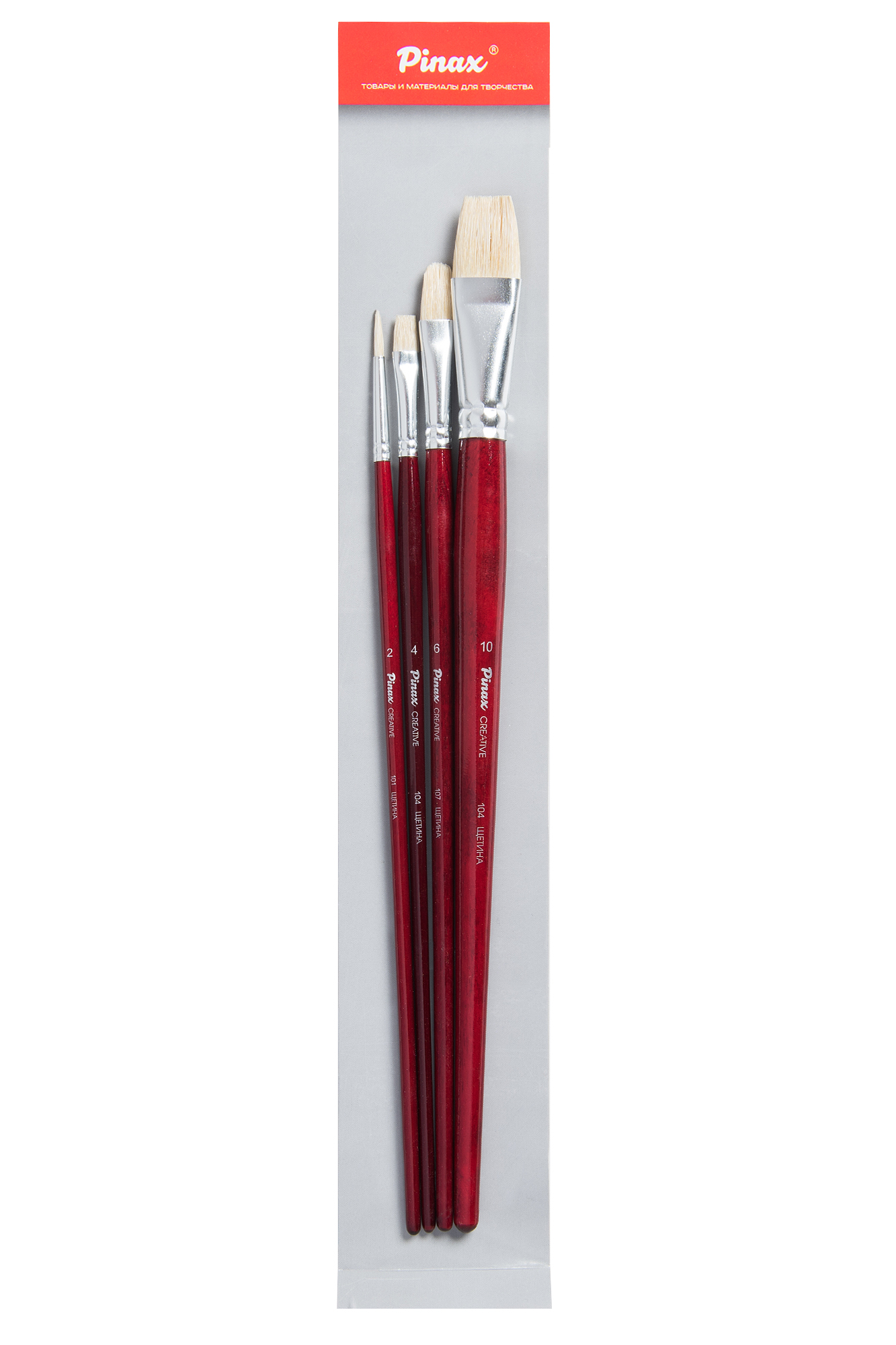 Комплектация: в данный набор входит 4 кисти серии «Creative» из щетины (круглая №2, овальная №6, плоские №4 и 10) Характеристика: кисти этой серии изготавливаются из щетины Chunking. Для формирования пучка кисти использовано большее количество расщепленных волосков, благодаря этому кисти набирают большее количество краски и с легкостью ее переносят на поверхность работы. Кисти выполнены на ручке, которая покрыта полупрозрачным глянцевым лаком. Применение: кисти этой серии подойдут для профессионального и для любительского использования. Они подходят для выполнения работ акрилом, маслом или гуашью. Кисти такой формы удобны для окрашивания больших площадей. Производство: данный товар представлен брендом Pinax. Pinax — мировой бренд товаров, который представлен на российском рынке с начала XXI века. Изначально компания производила только кисти для художественных работ, но затем расширила свое производство и не потеряв качество своей продукции начала производить холсты, мольберты и аксессуары для художников. Сейчас ассортимент включает в себя большое количество наименований.