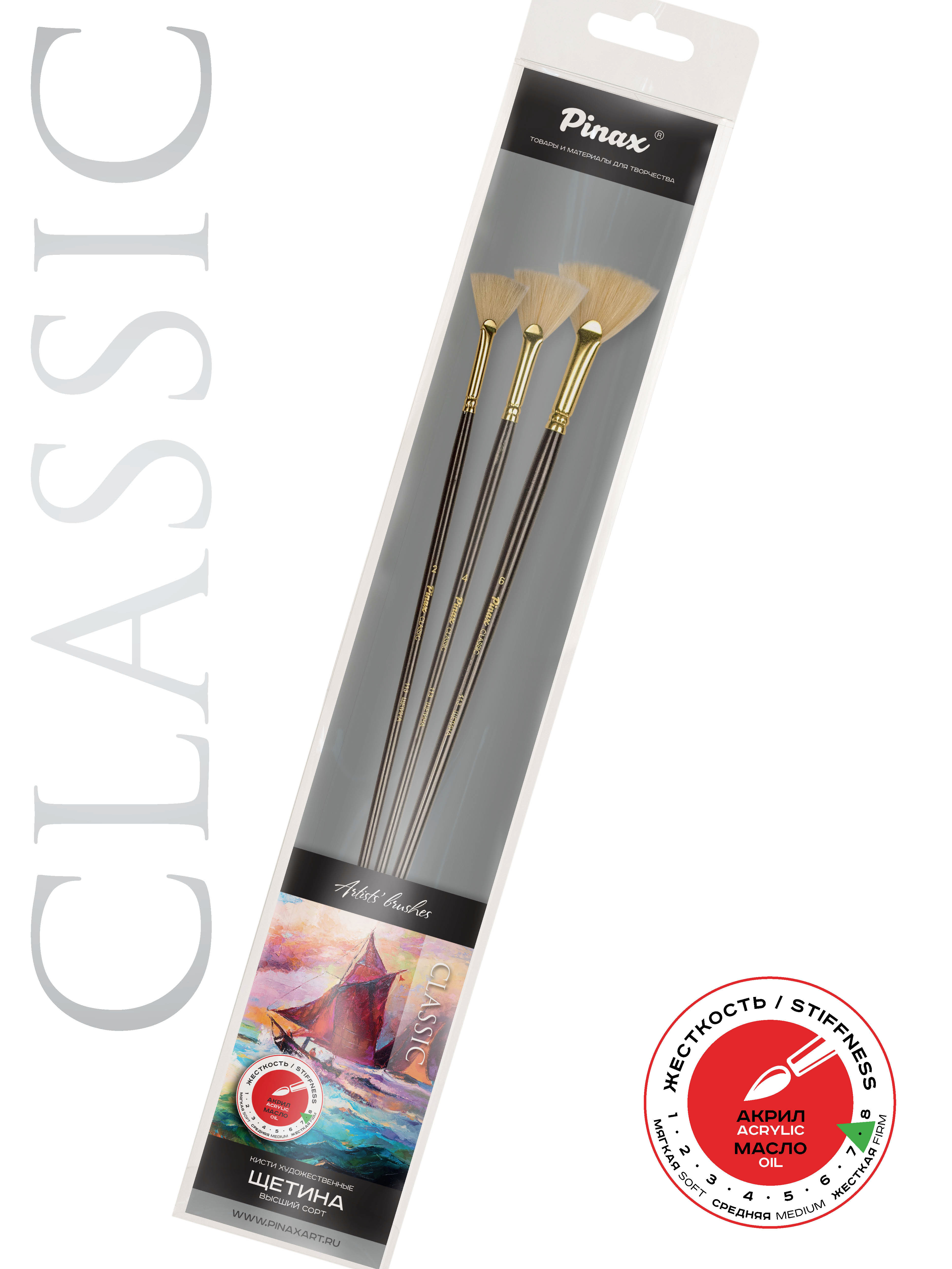 О наборе: в наборе представлены 3 веерные кисти из натуральной щетины с разным размером пучка на длинной ручке. Характеристика: кисти серии изготавливаются вручную. Для производства используется натуральная китайская щетина (Chunking) высокого качества. Щетина перед производством кистей проходит специальную обработку: она отбеливается и очищается химическим составом. Пучок кисти формируется вручную, так чтобы все волоски были направлены к центру, такая форма называется «interlocked». Ворс кисти упругий и даже после длительного использования с растворителями не теряет своей формы. Пучок кисти отличается от других кистей свой формой, которая визуально напоминает веер. Кисти производятся на длинной ручке, которая покрыта тремя слоями рояльного лака. Применение: кисти этой серии в основном используются для работы масляными и акриловыми красками. На усмотрение художника они могут быть использованы с другими художественными материалами. Кисти такой формы удобны для придания специальных эффектов в живописи. Производство: данный товар представлен брендом Pinax. Pinax — мировой бренд товаров, который представлен на российском рынке с начала XXI века. Изначально компания производила только кисти для художественных работ, но затем расширила свое производство и не потеряв качество своей продукции начала производить холсты, мольберты и аксессуары для художников. Сейчас ассортимент включает в себя большое количество наименований.