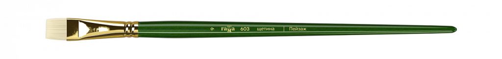Кисть из отбеленной и очищенной специальными химическими реагентами щетины — даже после продолжительного использования не теряет форму. Длинная ручка кисти покрыта глянцевым лаком изумрудного цвета. В пучке преобладают волоски с расщепленным кончиком, поэтому кисть одинаково хорошо наполняется и отдает краску. Упругий и прочный свиной волос отлично подходит для работы с тяжелыми масляными и акриловыми красками. Щетина износоустойчива к сильным растворителям.