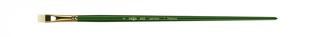 Кисть из отбеленной и очищенной специальными химическими реагентами щетины — даже после продолжительного использования не теряет форму. Длинная ручка кисти покрыта глянцевым лаком изумрудного цвета. В пучке преобладают волоски с расщепленным кончиком, поэтому кисть одинаково хорошо наполняется и отдает краску. Упругий и прочный свиной волос отлично подходит для работы с тяжелыми масляными и акриловыми красками. Щетина износоустойчива к сильным растворителям.